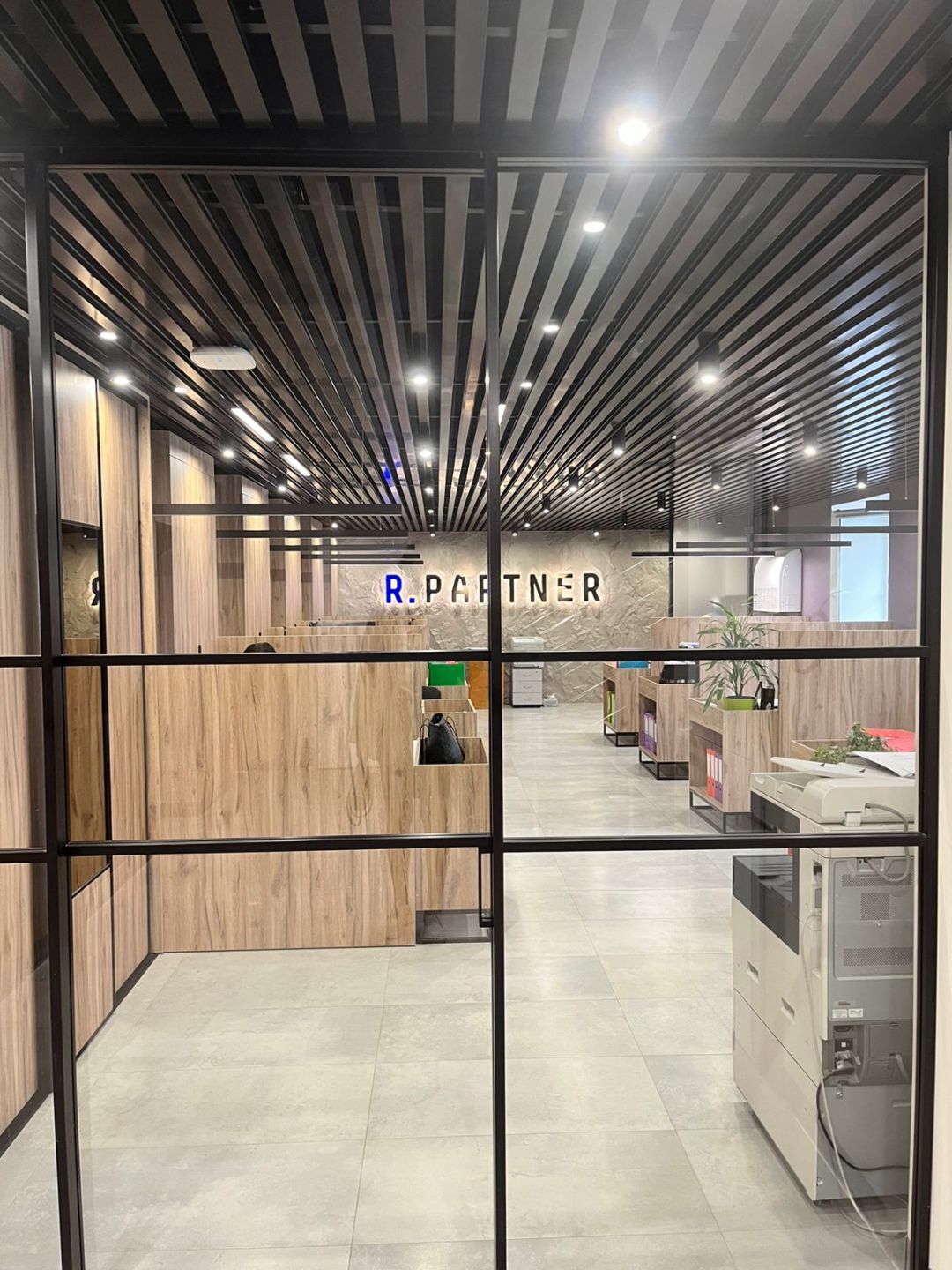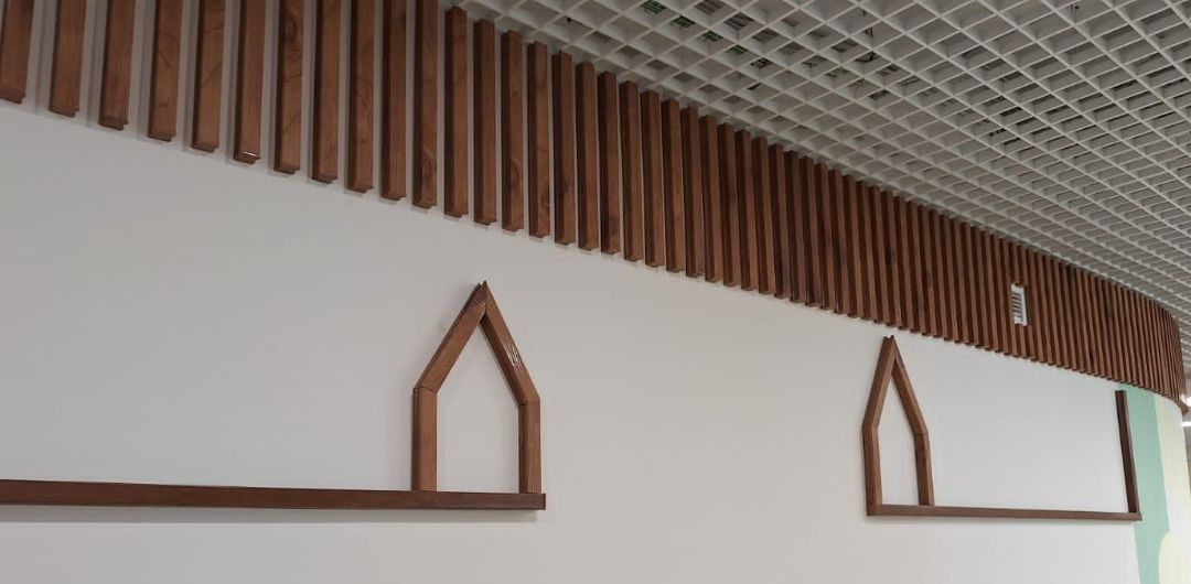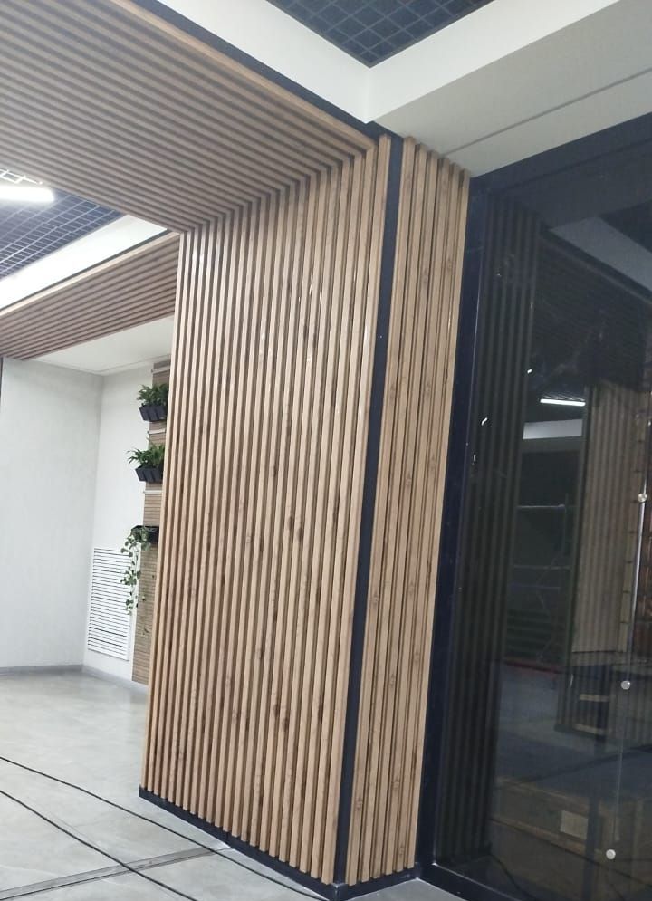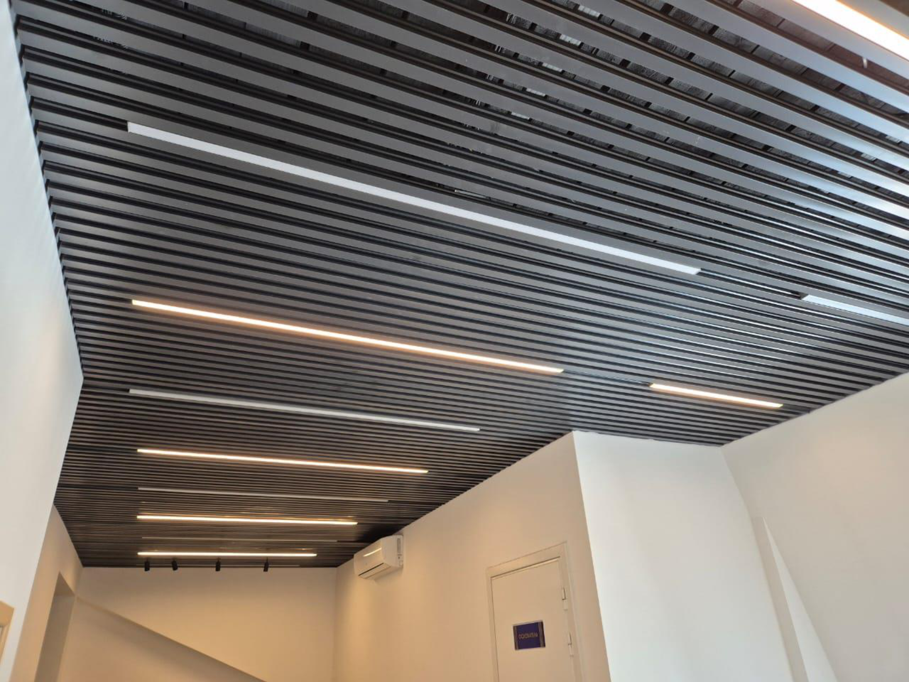 Каждый потолок создаётся под конкретный проект: длина реек, шаг и ширина подбираются индивидуально. Мы предлагаем варианты окраски по RAL и покрытия с имитацией дерева — от строгих индустриальных оттенков до тёплой текстуры под дуб или ясень. Потолок становится полноценным элементом интерьера, а не просто фоном.